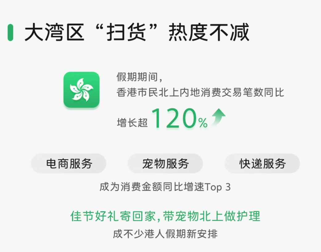 据南方+记者了解到,粤港澳大湾区不仅仅是最热门的旅游目的地,同时也是出游热度最高的地区。其中香港居民更是通过“拼假”北上过节。WeChat港币钱包数据显示,香港市民北上内地消费交易笔数同比增长超120%。港人线上线下扫货热度不减,电商服务、宠物服务、快递服务成消费金额同比增速Top 3。此外,观看娱乐演出及赛事成十一期间香港市民北上休闲娱乐消费增速最快的项目。