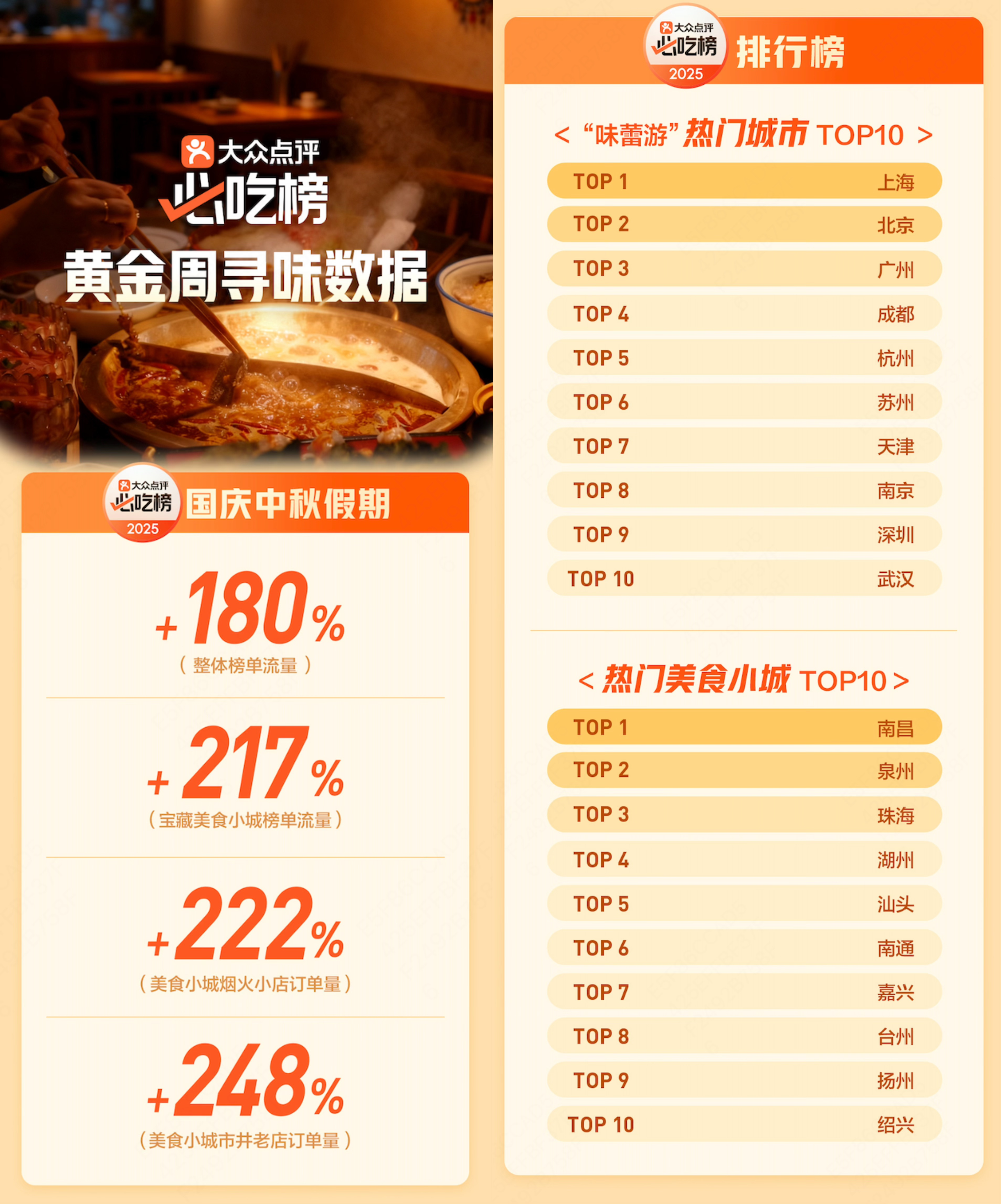 大众点评数据显示,10月1-8日,覆盖众多“必吃榜”等高分堂食餐厅的“品质外卖”异地用户流量环比节前增长近165%,其中广州和深圳还是“外卖味蕾游”热门城市TOP10的前两位。双节期间,更多元的“味蕾游”玩法,给各地餐厅生意带来了新增长。