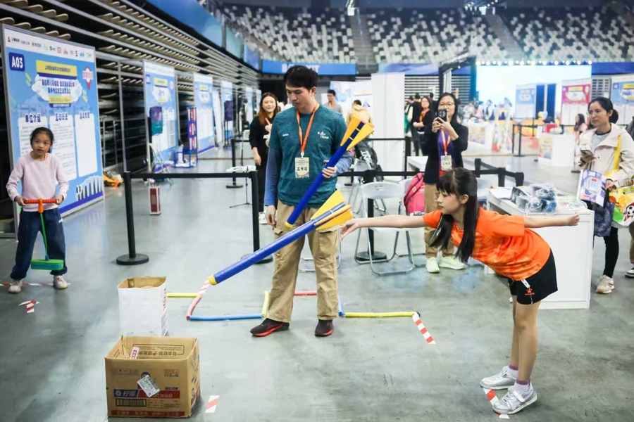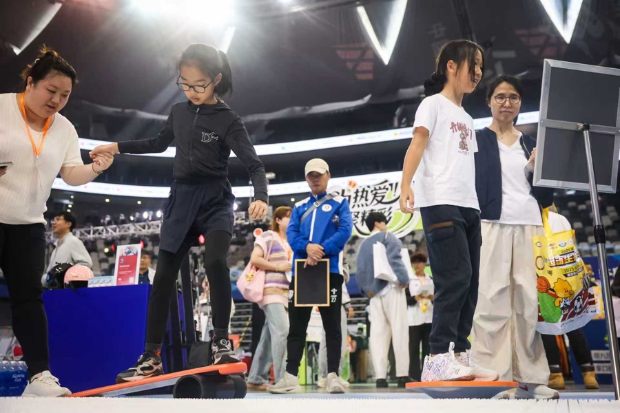 从击剑刺靶到机器狗互动,从AI下棋机器人到卡丁车DIY挑战,从滑板打卡墙到模拟飞行舱——这场嘉年华的互动体验堪称“神仙打架”。孩子们在旱地冰壶中斗智,在飞镖达人赛里拼准,在“小船长诞生记”里动手造船扬帆;足球绕杆、投篮争王、羽球九宫格……熟悉的项目也玩出了新花样;更有脊柱健康检测、心理能量测试等科学项目悄然融入,孩子们通过参与游戏、完成任务积累卡路里币,还可兑换奖品繁多的运动能量包,更有机会参与运动大乐透,赢取耀雪冰雪世界家庭套票、24寸自行车、儿童平衡车等重磅大奖,每一份汗水都有回响,每一枚印章都是成长印记——孩子们“身上有汗,眼里有光”,把“跑起来、动起来”变成了一场全民闯关的大型游戏。
