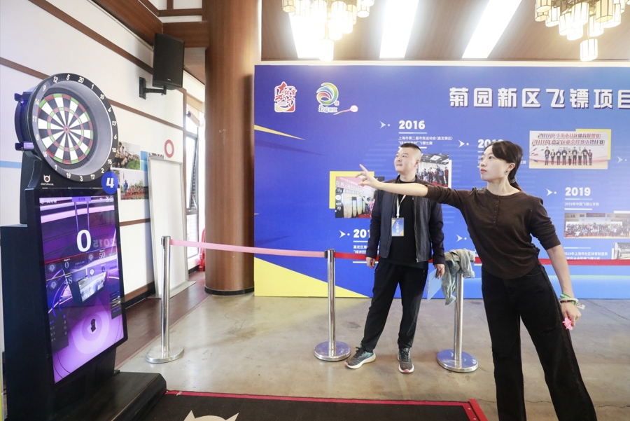 菊园新区深厚的飞镖底蕴在本次赛事中得到了充分体现。菊园天灵飞镖队作为区域的标杆队伍,刚刚荣获2025年上海城市业余联赛飞镖联赛暨第十五届上海市飞镖超级联赛团体赛甲组冠军。队伍长期以来受到新区重点支持,以头部梯队的姿态活跃于市级各类赛事,不断积累大赛经验。由飞镖骨干陈敏华——一位在菊园成长起来的优秀代表领衔的公益推广活动,持续为辖区飞镖运动的普及注入活力。陈敏华表示,“平时工作压力比较大,飞镖运动可以很好地减压,所以大家一直能坚持锻炼。”